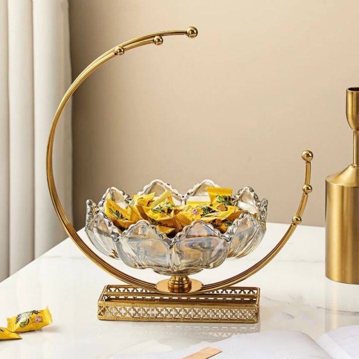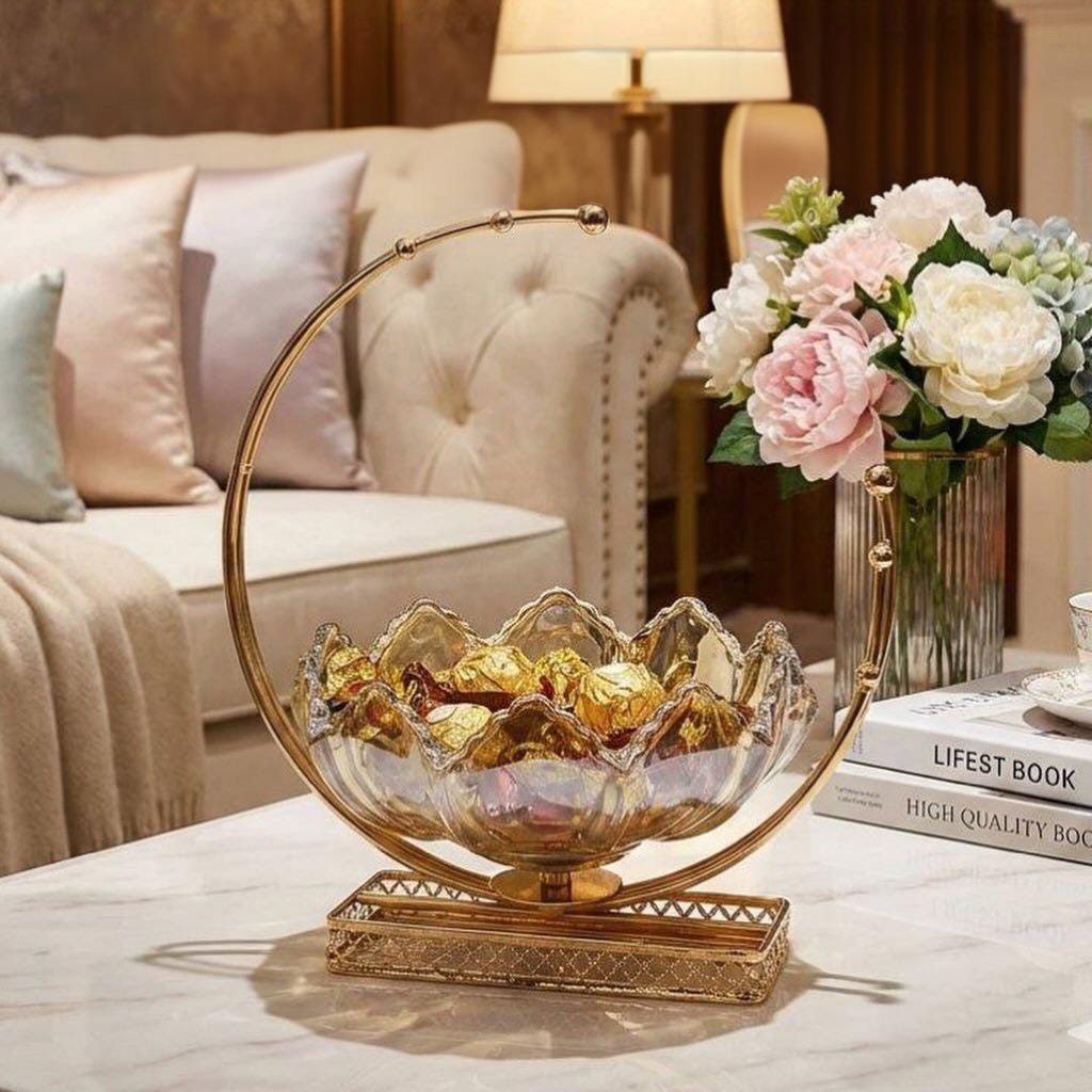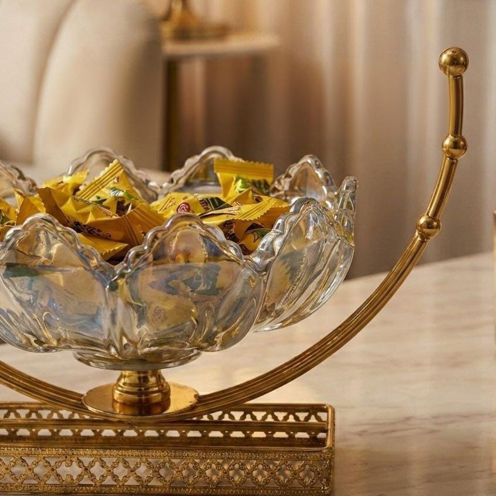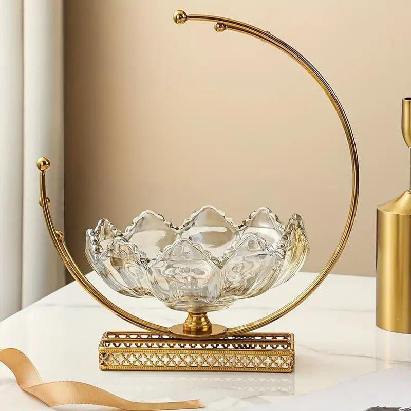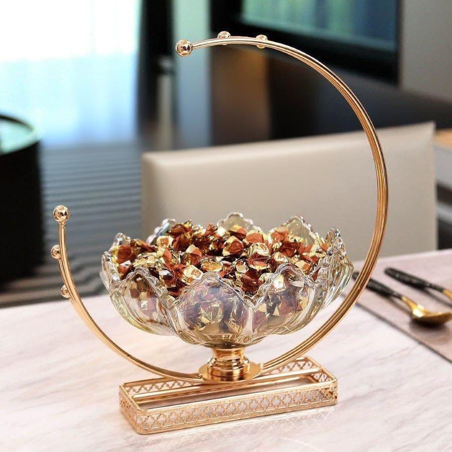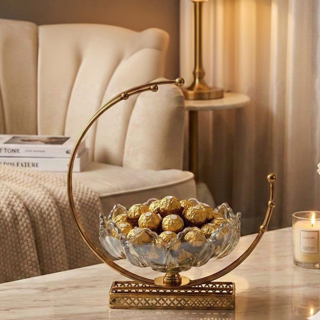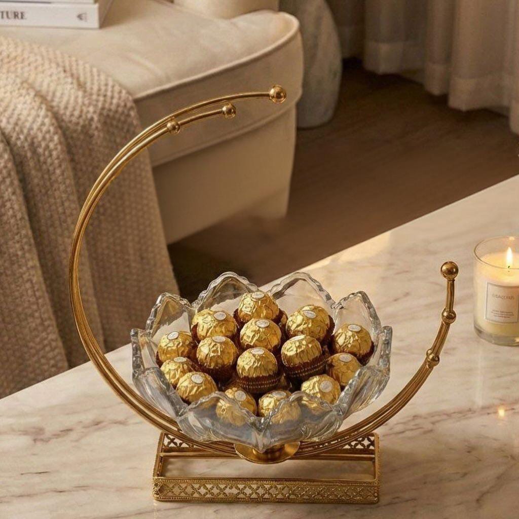 _طبق شكل هلال شيك جداً_هتستخدميه للتسالي و التمر و الشيكولاته_خامه معدن في زجاج ب لون دهبي_ القطر 25 سم